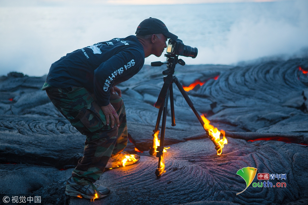 距離巖漿如此之近拍照十分危險(xiǎn)。攝影師Kawika Singson在拍攝過(guò)程中,經(jīng)歷了極大的危險(xiǎn)。流入海洋的巖漿量,風(fēng)向,以及巖漿基床的結(jié)實(shí)程度等風(fēng)險(xiǎn)都需要考慮。 圖片來(lái)源:視覺(jué)中國(guó)