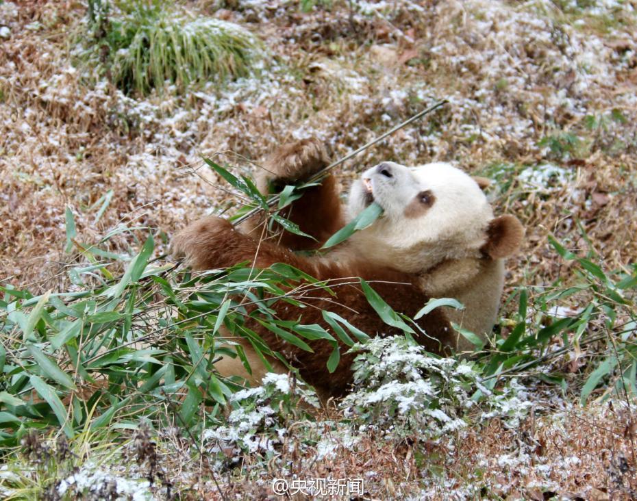 全球僅存棕色大熊貓七仔見雪變身“雪花熊”