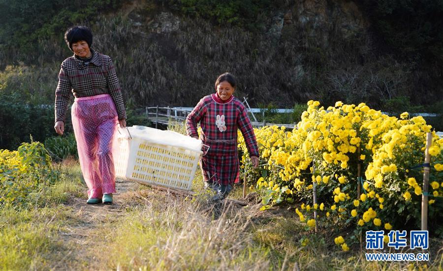 11月8日,婺源縣思口鎮(zhèn)農(nóng)戶在運(yùn)送采摘的皇菊。新華社記者 胡晨歡 攝
