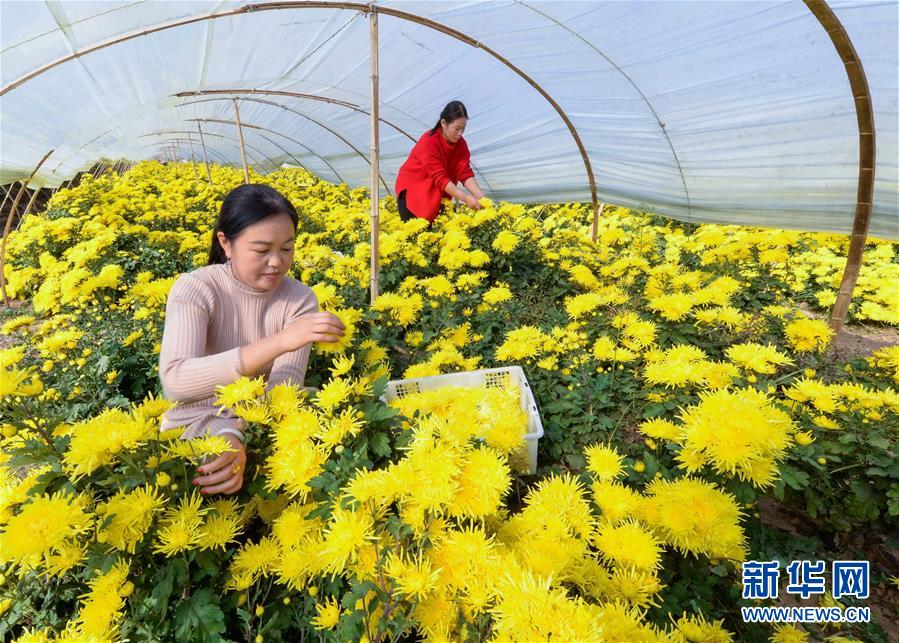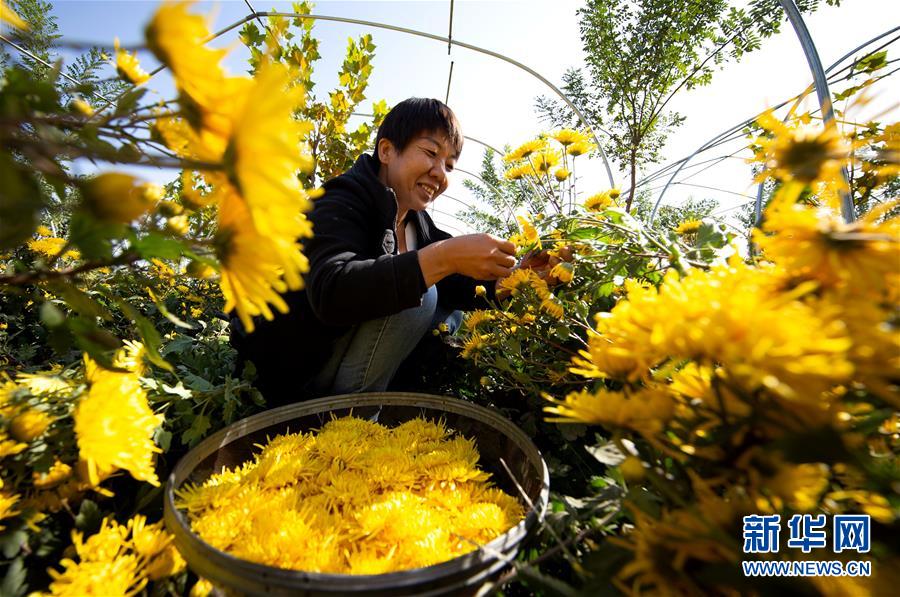 10月30日,武安市午汲鎮(zhèn)東河下村村民在采摘菊花。 新華社記者 王曉 攝