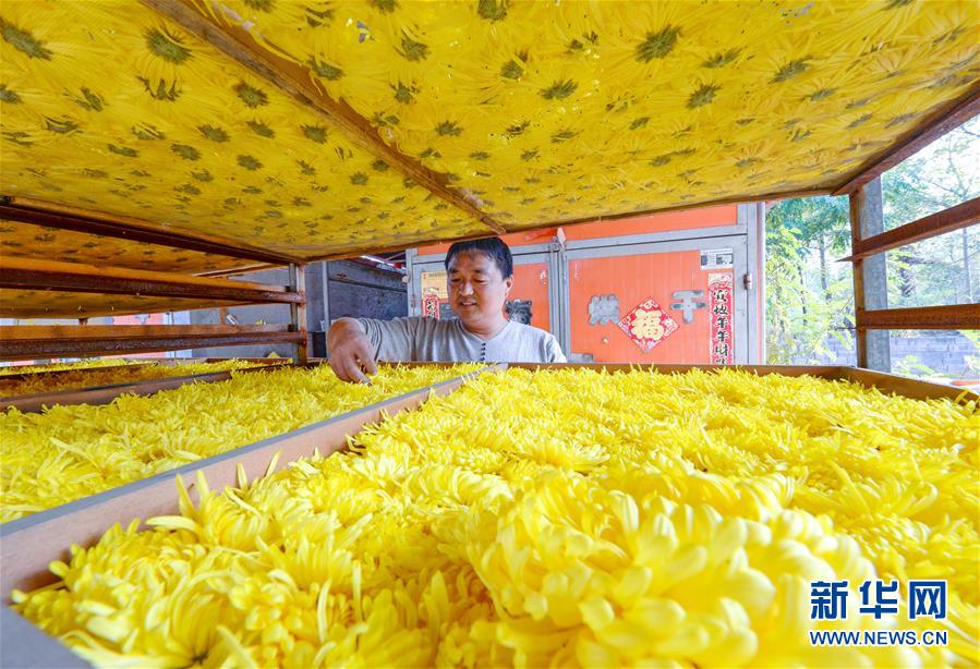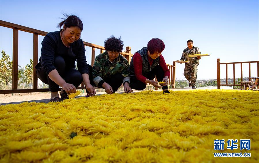 10月30日,武安市午汲鎮(zhèn)東河下村村民在晾曬菊花。 新華社記者 王曉 攝