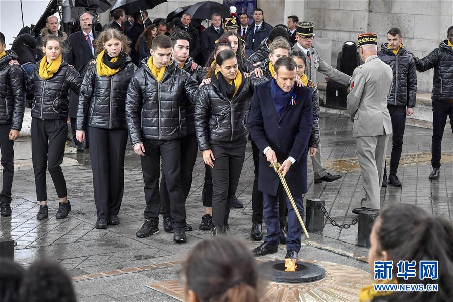 11月11日,在法國(guó)巴黎,法國(guó)總統(tǒng)馬克龍?jiān)诩o(jì)念儀式上撥旺無(wú)名烈士墓的火焰。當(dāng)日,法國(guó)政府在巴黎凱旋門前舉行儀式,隆重紀(jì)念第一次世界大戰(zhàn)結(jié)束一百周年。新華社記者 陳益宸 攝