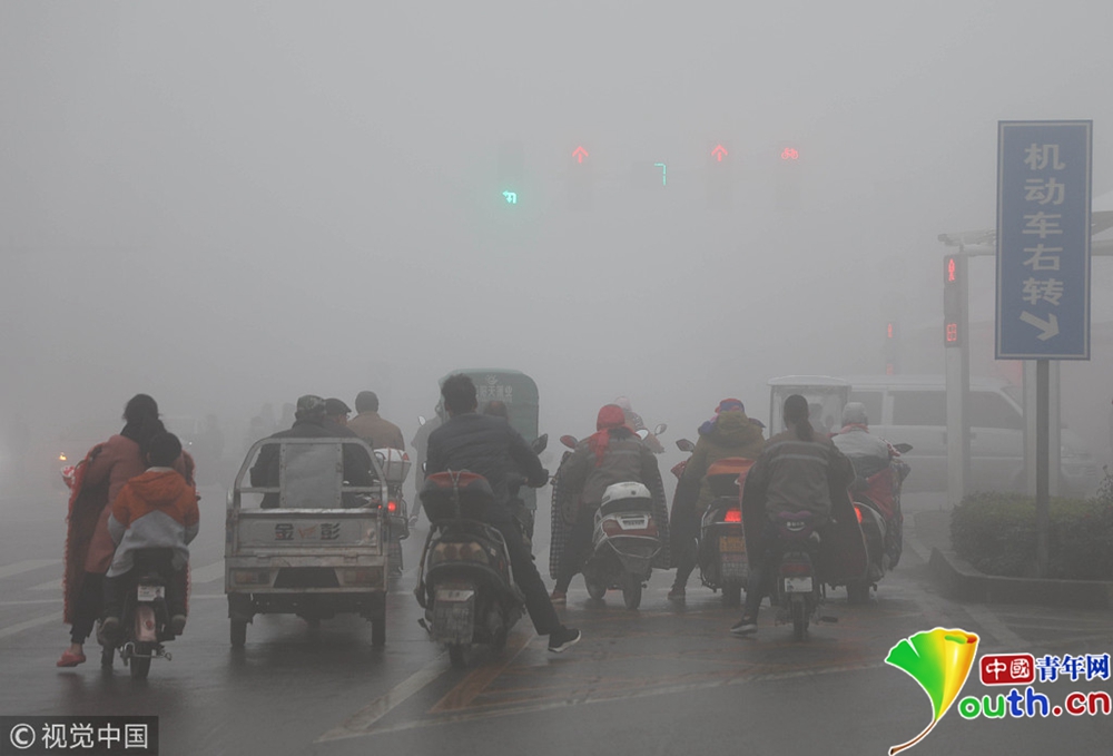 2018年11月12日,河南平頂山寶豐縣出現(xiàn)大霧, 街頭汽車打開霧燈,行人小心行走。