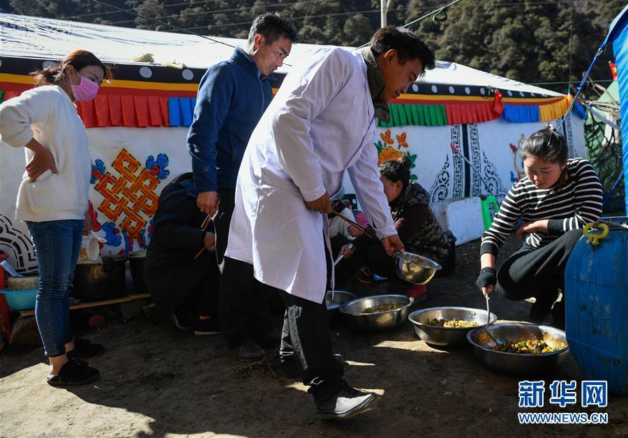11月12日,在西藏昌都市江達縣波羅鄉(xiāng)康扎西安置點,工作人員在臨時廚房打飯。 西藏自治區(qū)江達縣波羅鄉(xiāng)康扎西安置點,離波羅鄉(xiāng)政府直線距離約3公里,位于一處地勢開闊平緩的山谷中,比堰塞湖水面高出100多米。10月11日金沙江白格段山體滑坡發(fā)生后,當(dāng)?shù)鼐驮谶@里設(shè)立了安置點,安置附近受災(zāi)群眾。 新華社記者 劉東君 攝