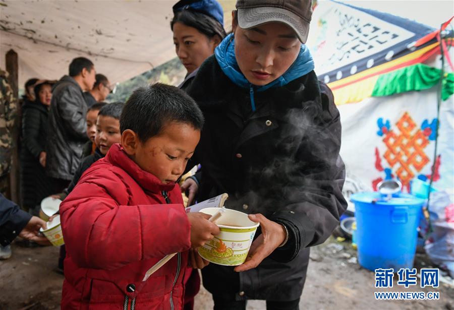 波羅鄉(xiāng)工作人員在熱多村安置點內(nèi)的“臨時做飯點”為波羅鄉(xiāng)第一小學(xué)學(xué)生盛晚飯(10月14日攝)。