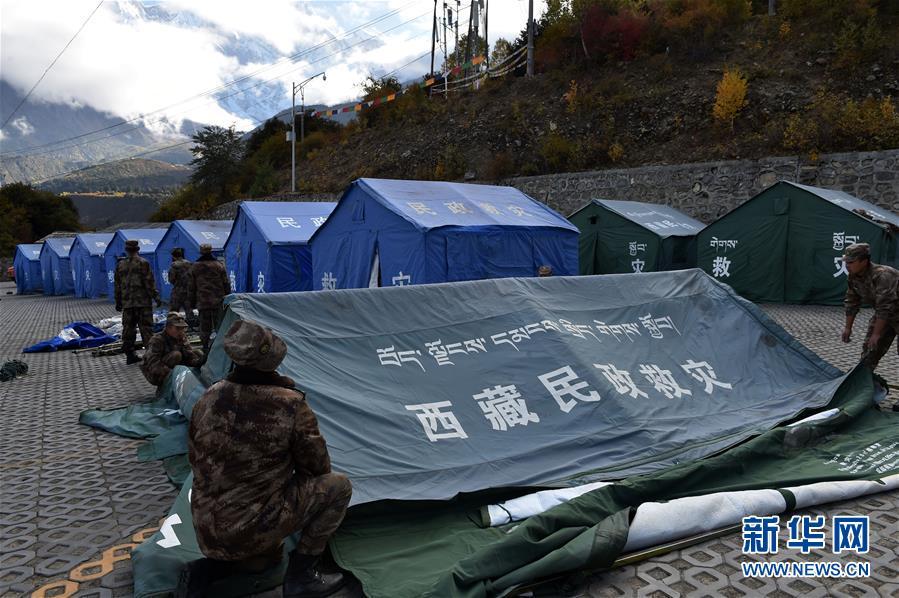 10月19日,救援人員在米林縣派鎮(zhèn)尼定村搭建安置點。 記者從西藏自治區(qū)林芝加拉村雅魯藏布江堰塞湖災(zāi)情應(yīng)急搶險工作第二場新聞發(fā)布會上獲悉,19日13時30分,雅魯藏布江米林縣堰塞體上游水位超過堰塞體,開始自然過流,上游水位正在緩慢下降。目前,各項搶險救援工作正在有序開展。 新華社記者 覺果 攝