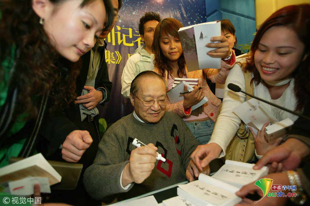 2005年12月17上午,中國(guó)南北文壇兩位大俠金庸和二月河在深圳五洲賓館和各地記者進(jìn)行了一場(chǎng)精彩對(duì)話。金庸迷找金庸簽名。圖片作者:北辰