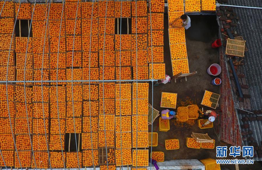 10月17日,廣西桂林市平樂(lè)縣沙子鎮(zhèn)渡河村農(nóng)民在晾曬柿子(無(wú)人機(jī)拍攝)。 金秋時(shí)節(jié),農(nóng)民們忙著收獲成熟的農(nóng)作物,喜迎豐收。 新華社記者 黃孝邦 攝