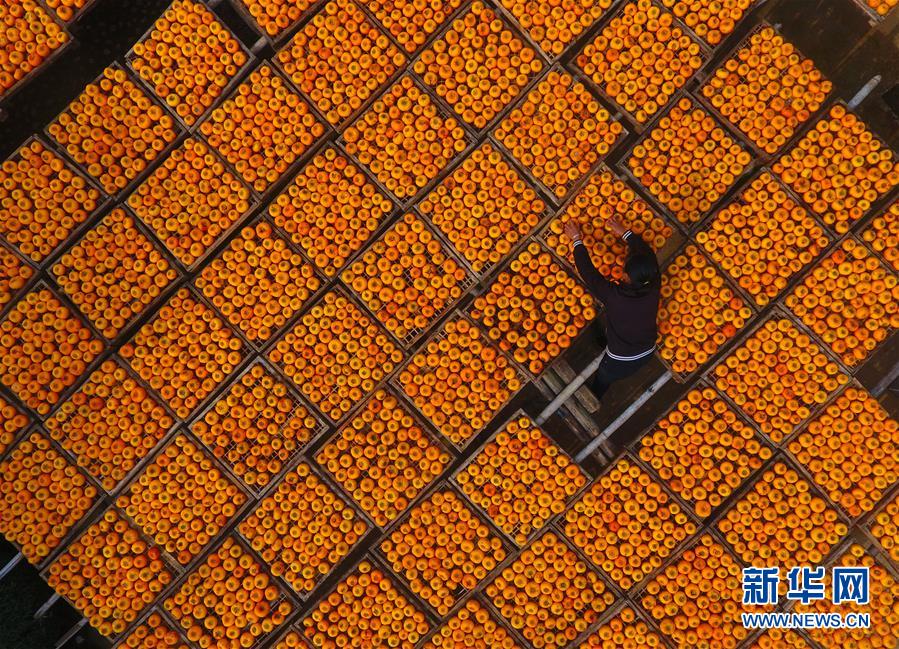 10月17日,廣西桂林市平樂縣沙子鎮(zhèn)渡河村農(nóng)民在晾曬柿子(無人機(jī)拍攝)。 金秋時(shí)節(jié),農(nóng)民們忙著收獲成熟的農(nóng)作物,喜迎豐收。 新華社記者 黃孝邦 攝