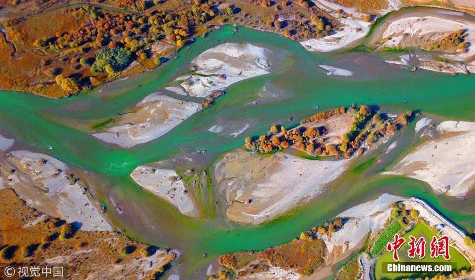 10月5日,新疆巴音郭楞,流過新疆和靜縣巴潤哈爾莫敦鎮(zhèn)的開都河秋景(無人機拍攝)。 圖片來源:視覺中國