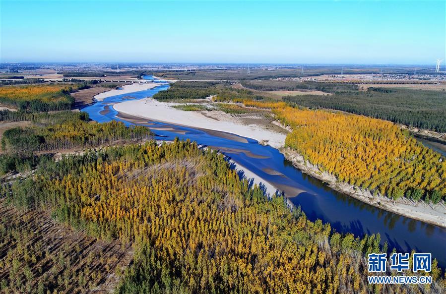 這是河北省樂亭縣境內(nèi)的灤河秋色(11月6日無人機拍攝)。