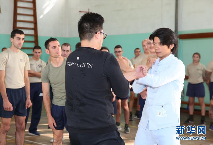 11月13日,在馬耳他首都瓦萊塔,鄭祖杰(前右)向馬耳他士兵展示詠春拳。 當日,中國國家級非物質(zhì)文化遺產(chǎn)詠春拳代表性傳承人鄭祖杰走進馬耳他武裝部隊,向官兵展示詠春拳。這一活動是馬耳他中國文化中心與馬耳他武術(shù)協(xié)會合辦的詠春拳系列展示活動之一。 新華社記者 袁韻 攝