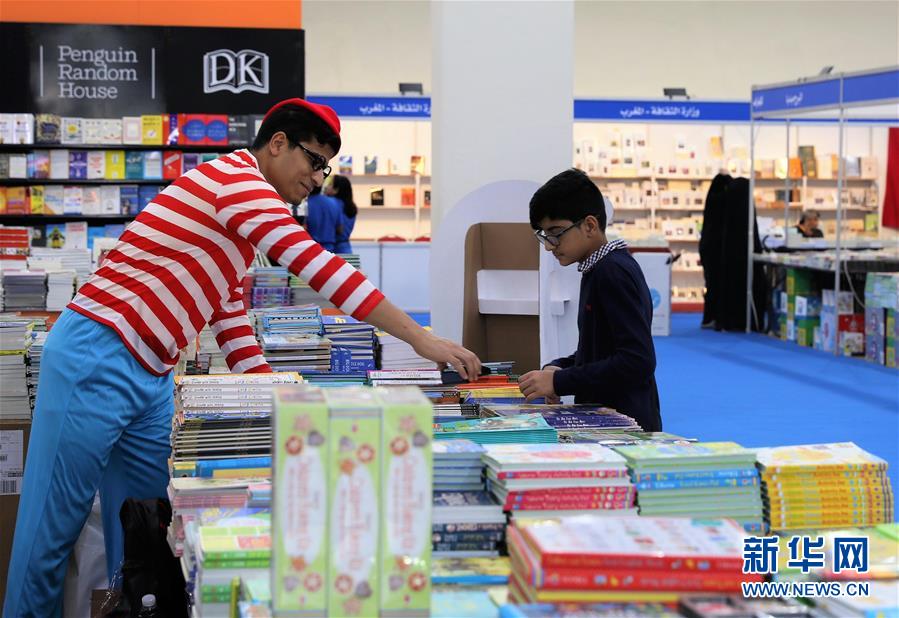 11月14日,在科威特國際展覽中心,工作人員(左)向一個男孩介紹圖書。 第43屆科威特國際書展14日在科威特國際展覽中心開幕,共有來自26個國家和地區(qū)的505家出版機構參展。 新華社記者 聶云鵬 攝