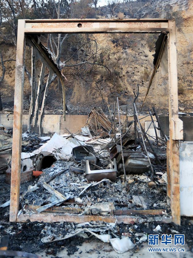 這是11月10日在美國加利福尼亞州馬里布市拍攝的一處被燒毀的廢墟。連日來,美國加利福尼亞州野火肆虐。 新華社記者李穎攝
