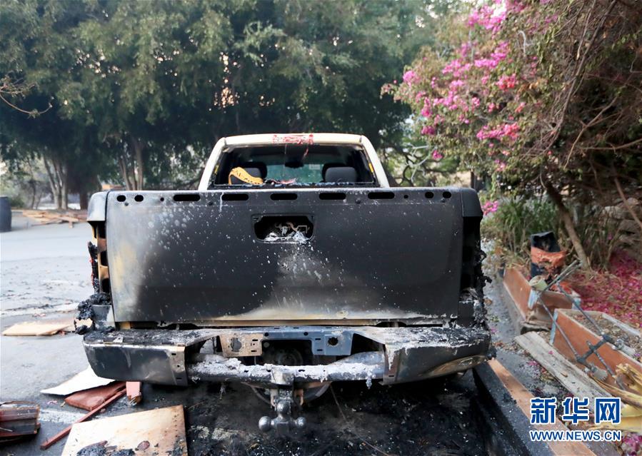 這是11月10日在美國(guó)加利福尼亞州馬里布市拍攝的一輛被燒毀的汽車。連日來(lái),美國(guó)加利福尼亞州野火肆虐。 新華社記者李穎攝