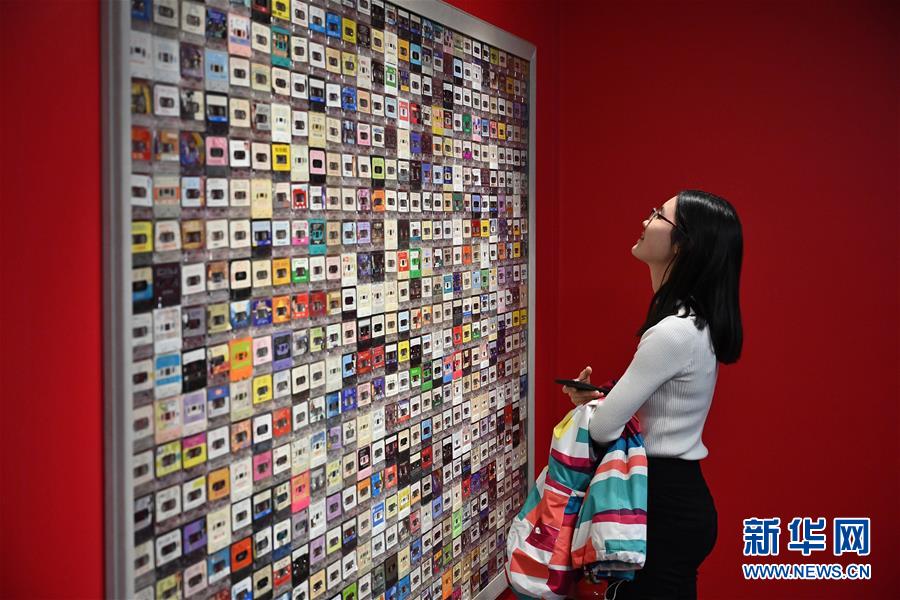 11月15日,一名參觀者在“時(shí)光博物館”里觀看懷舊磁帶墻。