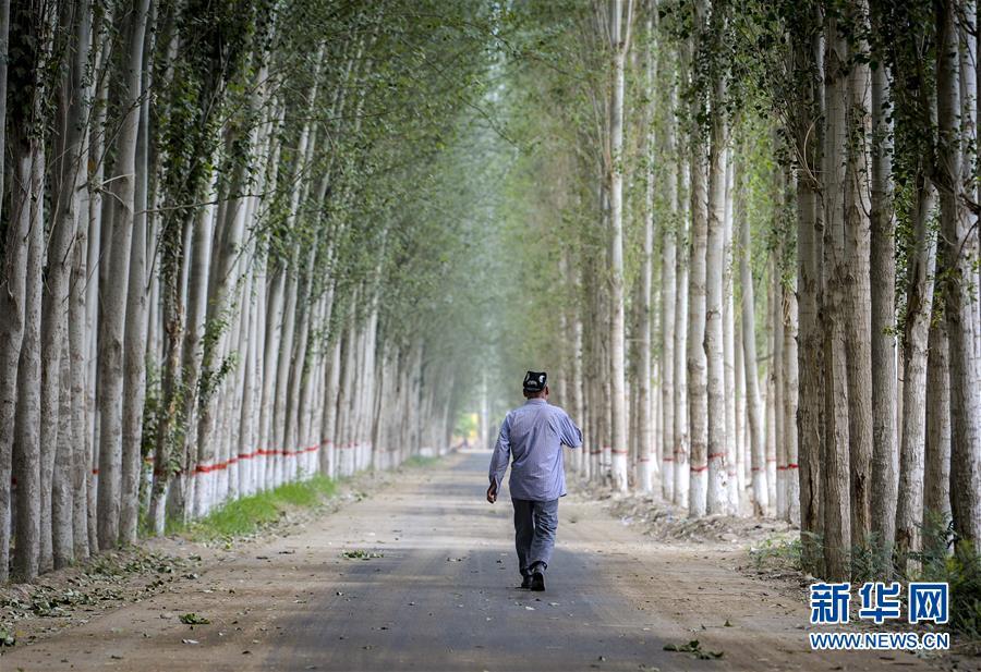 在新疆和田市伊力其鄉(xiāng)依蓋爾其村,如則托合提·如孜走在鄉(xiāng)間小路上(6月6日攝)。 新華社記者 趙戈 攝