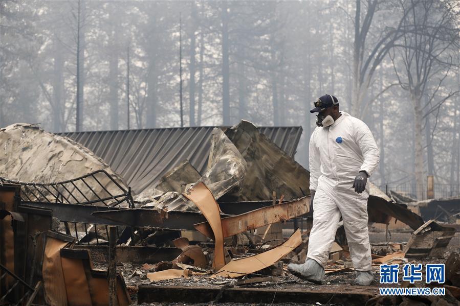 11月13日,在美國加利福尼亞州天堂鎮(zhèn),搜救人員在山火過后的廢墟工作。