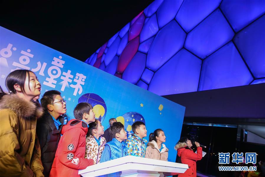 11月20日,在北京舉行的世界兒童日主題活動(dòng)上,國家游泳中心外墻被點(diǎn)亮。 新華社記者張玉薇攝