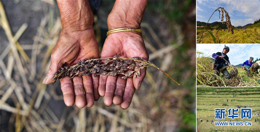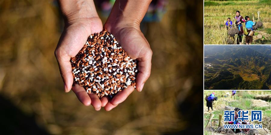拼版照片:左圖為在安太鄉(xiāng)元寶村,合作社負責人謝秀萍手捧今年收獲的三色香糯;右上圖為合作社負責人謝秀萍(中)和社員們在收香糯;右中圖為位于苗山深處的香糯種植基地;右下圖為謝秀萍在收香糯(照片均攝于10月30日)。謝秀萍是當?shù)叵闩捶N植合作社負責人,帶動幾百戶貧困戶種植香糯。香糯是廣西融水大苗山的特產(chǎn),它生長在高寒高海拔的特殊自然環(huán)境中,產(chǎn)量少,營養(yǎng)價值高。 廣西融水苗族自治縣是國家扶貧工作重點縣,全縣“九山半水半分田”,生活生產(chǎn)環(huán)境較為惡劣,脫貧攻堅任務艱巨,目前還有7.68萬貧困人口。面對經(jīng)濟發(fā)展落后、貧困面廣且程度深的現(xiàn)狀,當?shù)匕衙撠毠耘c創(chuàng)新產(chǎn)業(yè)扶持相結(jié)合,依托生態(tài)資源優(yōu)勢,實施“特色產(chǎn)業(yè)富民行動”,通過發(fā)展特色民族旅游、林下經(jīng)濟和特色養(yǎng)殖業(yè)等扶貧產(chǎn)業(yè),帶動貧困群眾依靠勤勞的雙手,拔窮根摘窮帽,實現(xiàn)脫貧致富。據(jù)了解,目前全縣貧困戶參與特色產(chǎn)業(yè)發(fā)展的有2.9萬戶,扶貧產(chǎn)業(yè)覆蓋率達95%。 新華社記者 黃孝邦 攝