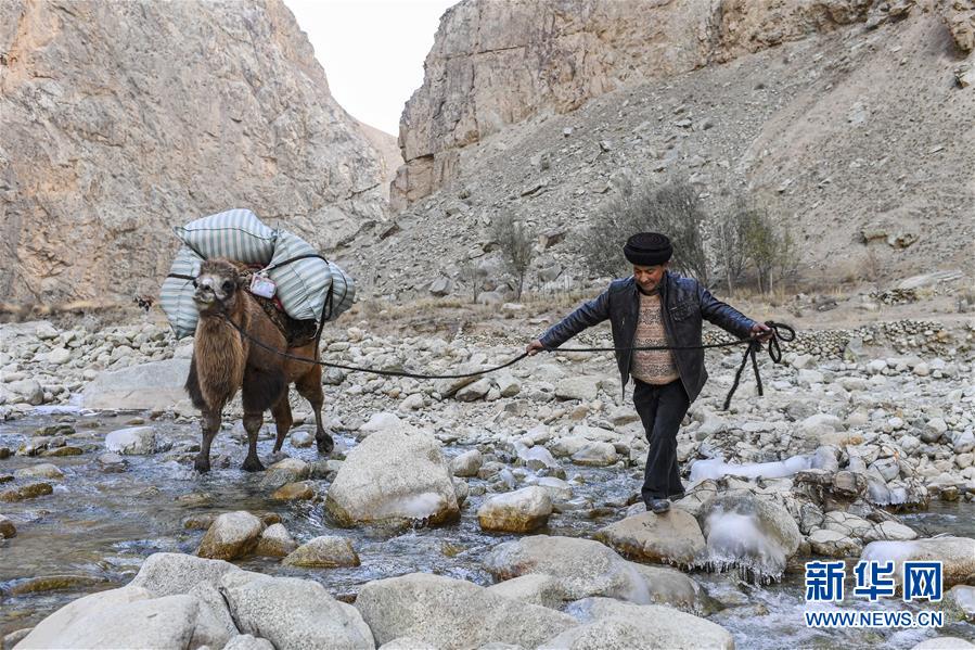 在去往阿克托尕欄桿村村委會的路上,都熱·加爾曼牽著馱有行李的駱駝通過山間河流(11月17日攝)。新華社記者胡虎虎攝