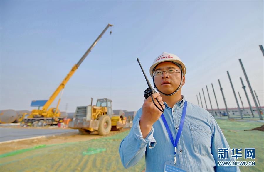 4月26日,來自中鐵上海工程局京雄城際鐵路五標(biāo)二分部的工程師韓正順在京雄城際鐵路工程五標(biāo)段小型構(gòu)件預(yù)制廠場(chǎng)地建設(shè)現(xiàn)場(chǎng)用對(duì)講機(jī)指揮作業(yè)。新華社記者王曉 攝 圖片來源:新華網(wǎng)