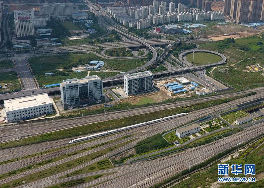一列動車在南寧市區(qū)行駛(9月4日無人機(jī)拍攝)。 廣西壯族自治區(qū)成立60年來,鐵路建設(shè)發(fā)生翻天覆地的變化。來自中國鐵路南寧局集團(tuán)有限公司的數(shù)據(jù)顯示,1958年廣西鐵路總里程為1346.3公里,如今廣西鐵路總里程達(dá)5191公里。廣西與周邊相鄰省份間實現(xiàn)動車“公交化”開行。此外,北部灣港—重慶班列、東盟海產(chǎn)品冷鏈班列、“百色一號”果蔬專列等的開通和運(yùn)營,強(qiáng)化了鐵路供給的針對性和有效性。鐵路成為助推廣西經(jīng)濟(jì)社會快速發(fā)展的“大動脈”。 新華社記者陸波岸攝