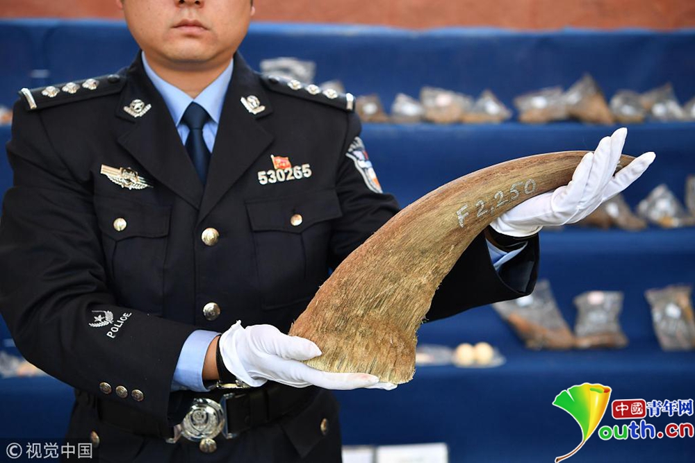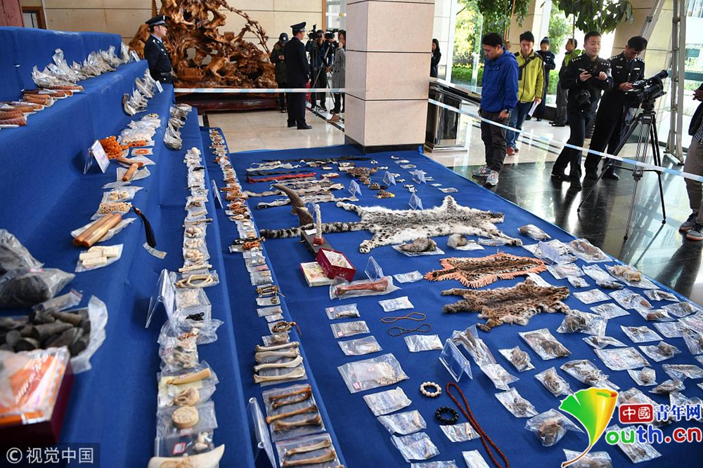 11月23日,現(xiàn)場(chǎng)展示警方查獲的野生動(dòng)物制品。當(dāng)日,昆明市森林公安局向媒體通報(bào),破獲一系列特大非法收購出售珍貴瀕危野生動(dòng)物及其制品案件。