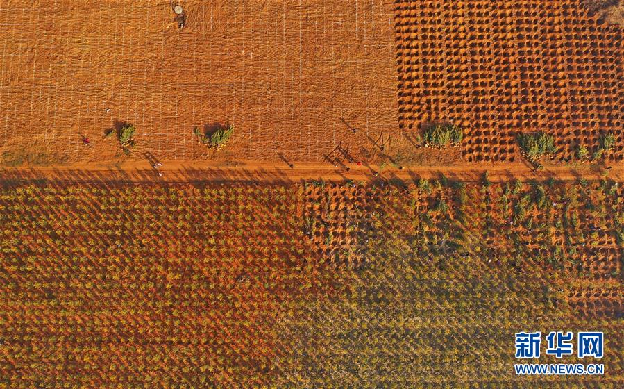 11月25日,遷安市蔡園鎮(zhèn)劉莊子村的村民在村北鐵礦廢料場(chǎng)栽植松樹(shù)(無(wú)人機(jī)拍攝)。