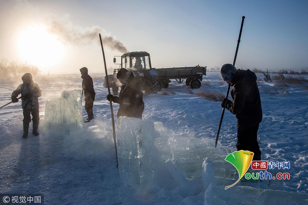 當(dāng)?shù)貢r(shí)間2018年11月27日,雅庫(kù)茨克,零下41攝氏度左右的氣溫下,村民在當(dāng)?shù)氐囊粋€(gè)湖中采集冰塊。當(dāng)?shù)睾芏嗳艘蕾囉谌诨鶋K解決供水,因?yàn)槎嗄陜鐾粮采w地區(qū)冬季氣溫極低,沒有其他的方式供應(yīng)水。