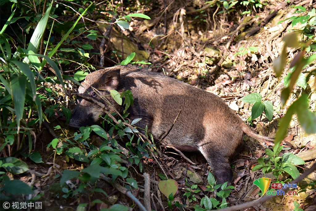 山豬個頭不大,身長1米左右,毛色呈深褐色。從體型判斷,這只山豬應(yīng)該體重在35公斤左右,估計年齡只有1歲。