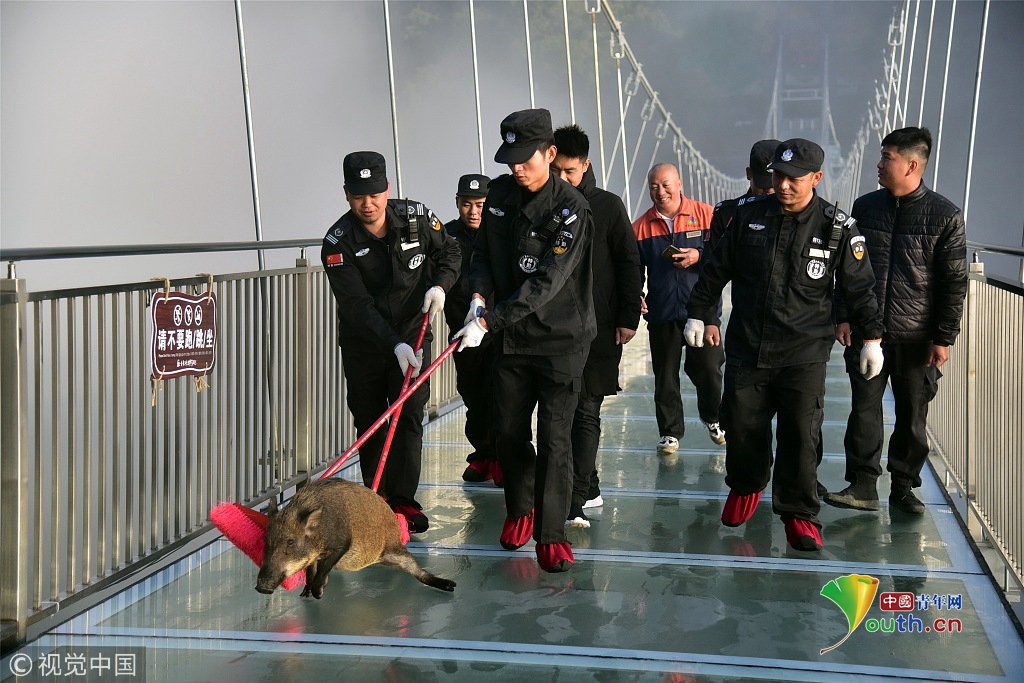 小野豬誤入玻璃橋嚇得發(fā)抖保安解救 豬:你們?nèi)祟愄膳铝?/h1>