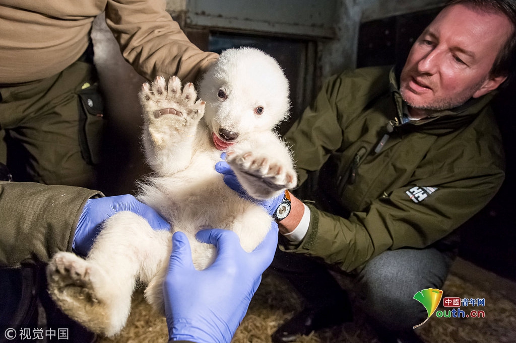 當(dāng)?shù)貢r(shí)間2017年1月12日,德國柏林,柏林蒂爾加滕動(dòng)物園為一只雄性北極熊寶寶檢查身體。熊寶寶于2016年11月3日出生,身高67厘米,體重4.6千克。