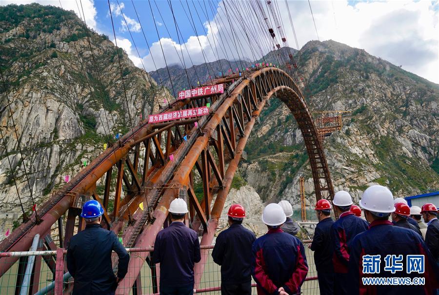 9月28日拍攝的川藏鐵路拉林段重點(diǎn)標(biāo)志性工程藏木特大橋合龍儀式現(xiàn)場(chǎng)。 當(dāng)日,隨著最后一節(jié)鋼管拱的對(duì)位和鎖定完畢,川藏鐵路拉林段藏木特大橋成功合龍,標(biāo)志著大橋主體結(jié)構(gòu)施工取得了關(guān)鍵性勝利。藏木特大橋由中國(guó)中鐵廣州局集團(tuán)承建,拱高112米,橋橫跨雅魯藏布江峽谷,水深66米。 新華社記者普布扎西攝
