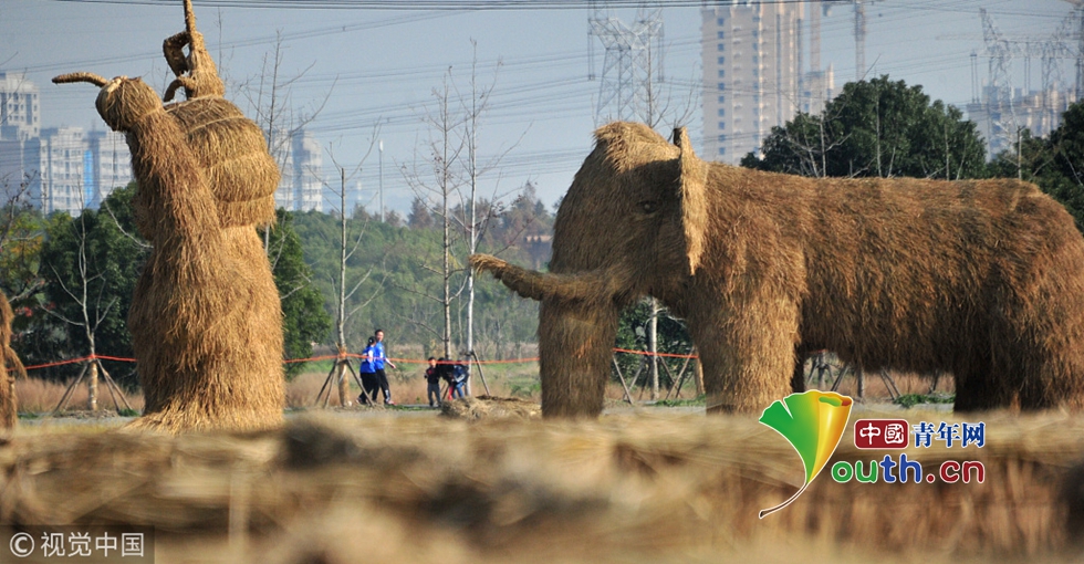 據(jù)悉,原本收割過的早稻由于不能焚燒,會(huì)直接粉碎入田。如今這些早稻的秸稈被搭成了景觀雕塑,也成了一道廢物利用的特色風(fēng)景。圖片來源視覺中國(guó)