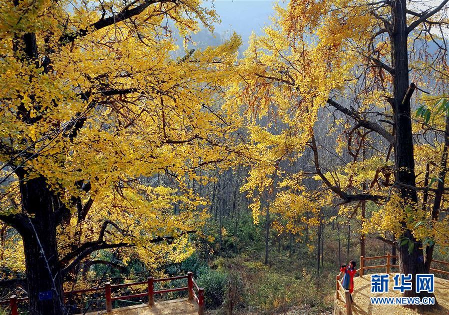 11月1日,游客在河南省嵩縣白河鄉(xiāng)下寺村古銀杏樹下拍攝秋景。 深秋時(shí)節(jié),河南省嵩縣白河鄉(xiāng)下寺村的古銀杏林為小山村披上了“金甲”。漫天黃葉,遍地金色,一幢幢民居掩映在色彩斑斕的世界里,美不勝收,吸引了眾多游客賞景拍照。 新華社記者 李安 攝
