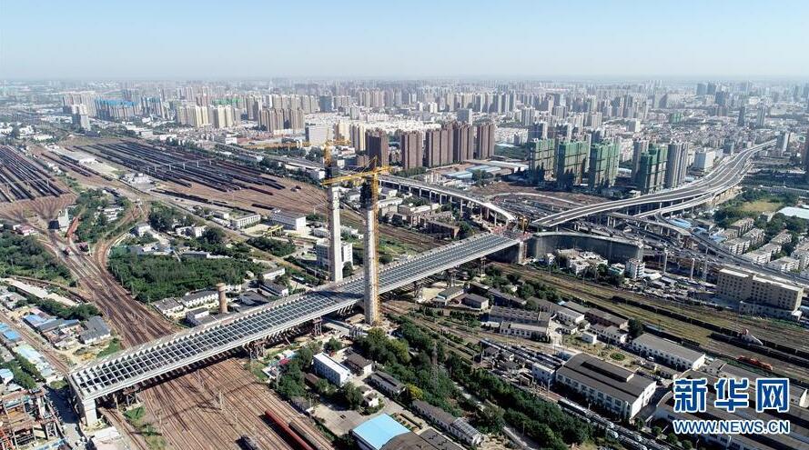 9月7日無人機拍攝的鄭北大橋鋼梁頂推施工現(xiàn)場。當日,跨越鄭州北站的鄭北大橋鋼梁頂推成功。鄭北大橋是東西走向的鄭州市農(nóng)業(yè)路快速通道工程的一部分,需跨越鄭州北站。由于列車不能中斷運行,鄭北大橋不能采用常見的搭腳手架方式施工,而是采用頂推法,即在大橋一端把橋身拼接好,然后一段一段朝著鐵路編組站上方送過去,最終完成橋梁架設。新華社記者朱祥攝