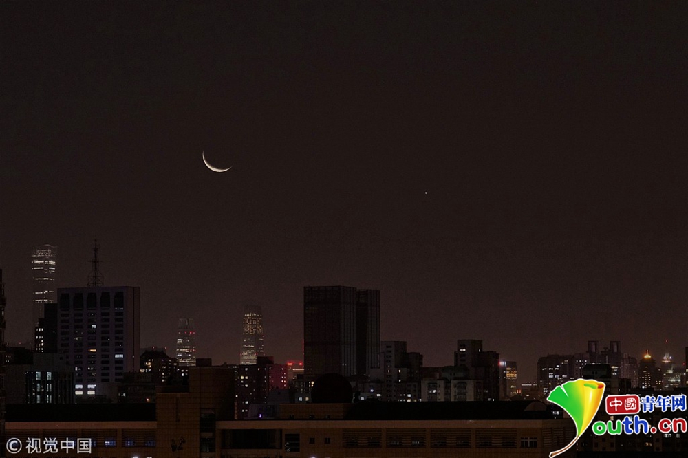 北京,天宇上演“金星合月”,清晨5點時,東南方低空出現一顆明亮的金星和一彎窄月近距離相依相伴的美麗畫面。