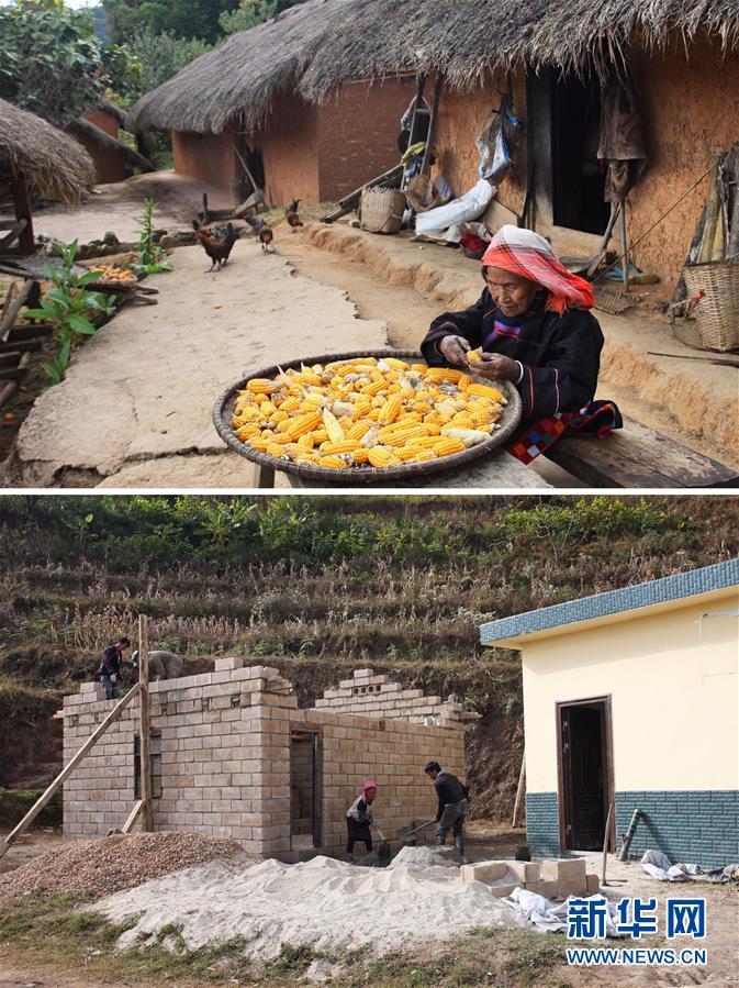 這是一張拼版照片。上圖:12月3日,在云南省瀾滄拉祜族自治縣南嶺鄉(xiāng)勐炳村龍?zhí)独险?1歲的李娜六老人在老宅前剝玉米;下圖:在云南省瀾滄拉祜族自治縣南嶺鄉(xiāng)勐炳村龍?zhí)洞迕裥〗M,李娜六老人的新宅正在建設(shè)中(12月3日攝)。 新華社記者杜涓涓攝