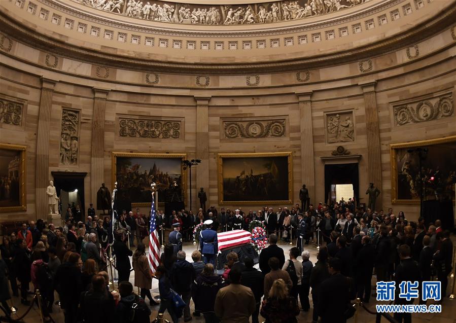 美國前總統(tǒng)老布什的遺體3日下午運(yùn)抵首都華盛頓,安放在國會大廈圓頂大廳,接受吊唁。
