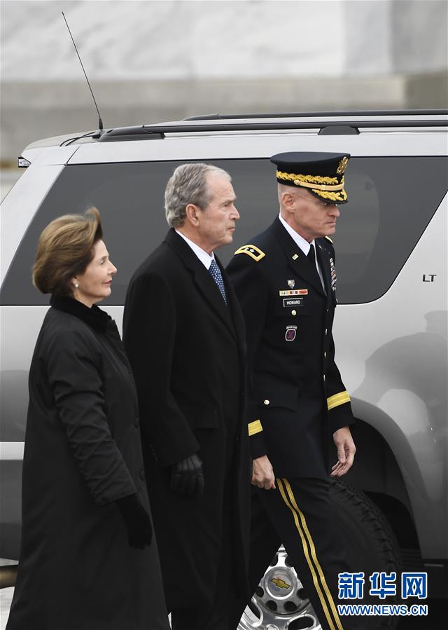 12月5日,在美國首都華盛頓,美國前總統(tǒng)喬治·沃克·布什(中)與夫人勞拉(左)抵達(dá)國會東廣場。