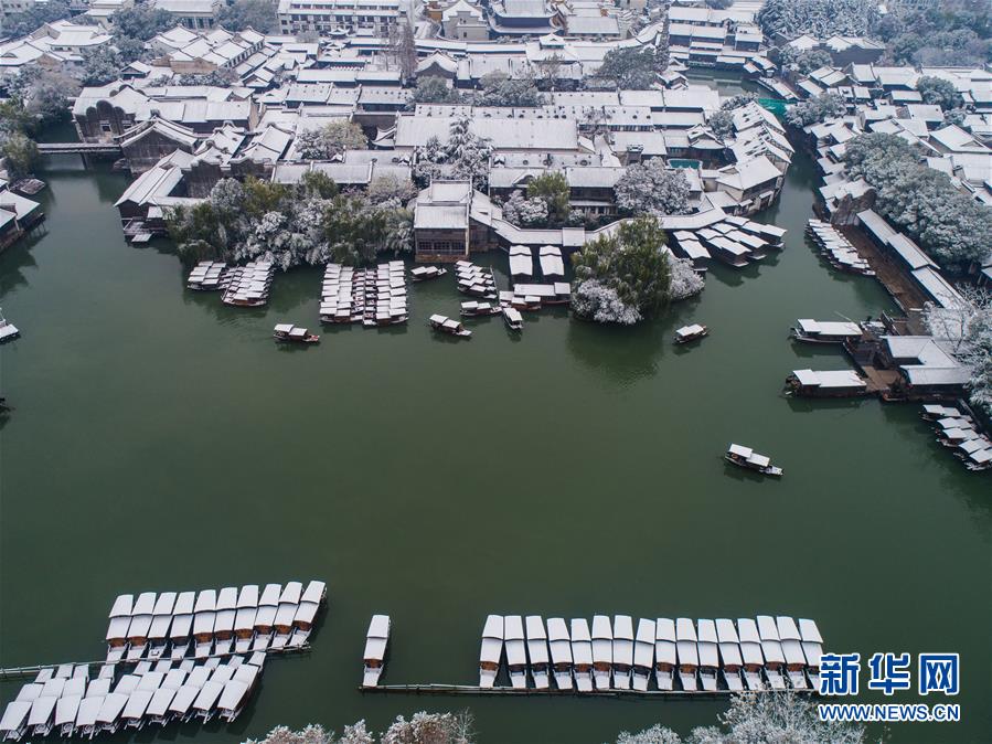 12月9日,空中俯瞰被白雪覆蓋的烏鎮(zhèn)景區(qū)(無人機拍攝)。 受冷空氣影響,浙江省桐鄉(xiāng)市迎來大范圍降雪,千年古鎮(zhèn)烏鎮(zhèn)被厚厚的白雪覆蓋。小橋流水、白墻黑瓦的江南水鄉(xiāng)古鎮(zhèn),呈現(xiàn)出冬日雪鄉(xiāng)的獨特韻味,吸引各地游客前來觀賞。 新華社記者 徐昱 攝