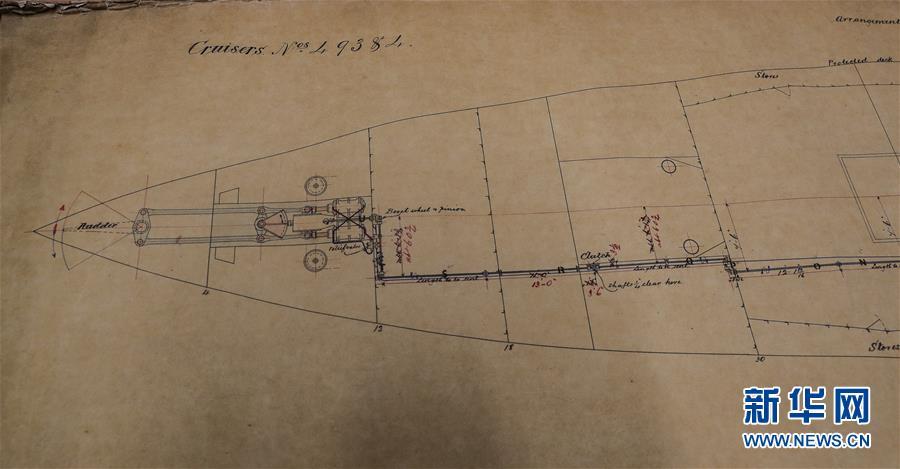 這是11月2日在英國紐卡斯?fàn)柕奶┒鳌枡n案館拍攝的致遠艦設(shè)計圖紙。 新華社記者日前在紐卡斯?fàn)柼┒鳌枡n案館查找北洋海軍史料時發(fā)現(xiàn)一套七張、檔案名為“中國巡洋艦舵機設(shè)計圖”的原始圖紙。塵封百年,甲午海戰(zhàn)中抗擊日艦后沉沒的清北洋海軍致遠艦部分原廠設(shè)計圖紙在其建造地——英國紐卡斯?fàn)柺械囊患覚n案館首次被發(fā)現(xiàn),為打撈那段悲壯的歷史提供了重要參考。 新華社記者 韓巖 攝
