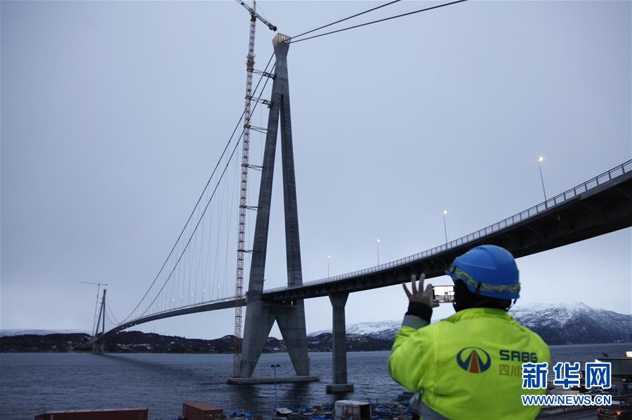 12月9日,中國工人和挪威市民在挪威哈羅格蘭德大橋上行走。 新華社記者梁有昶攝