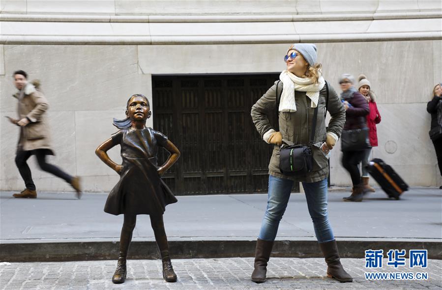 12月10日,在美國(guó)紐約,一名女士與紐約證券交易所前的“無(wú)畏女孩”銅像合影。 新華社記者 王迎 攝