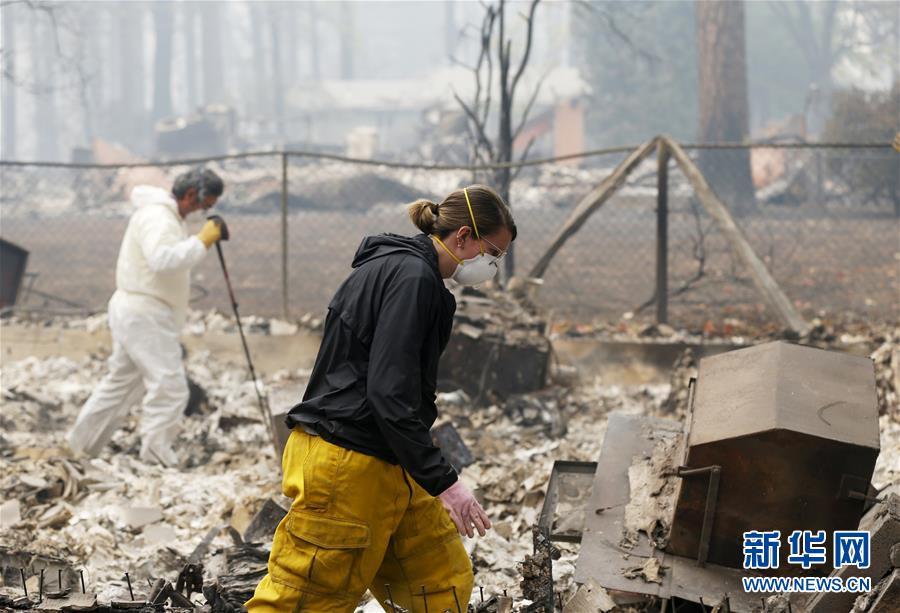 11月13日,在美國加利福尼亞州天堂鎮(zhèn),搜救人員在山火過后的廢墟工作。