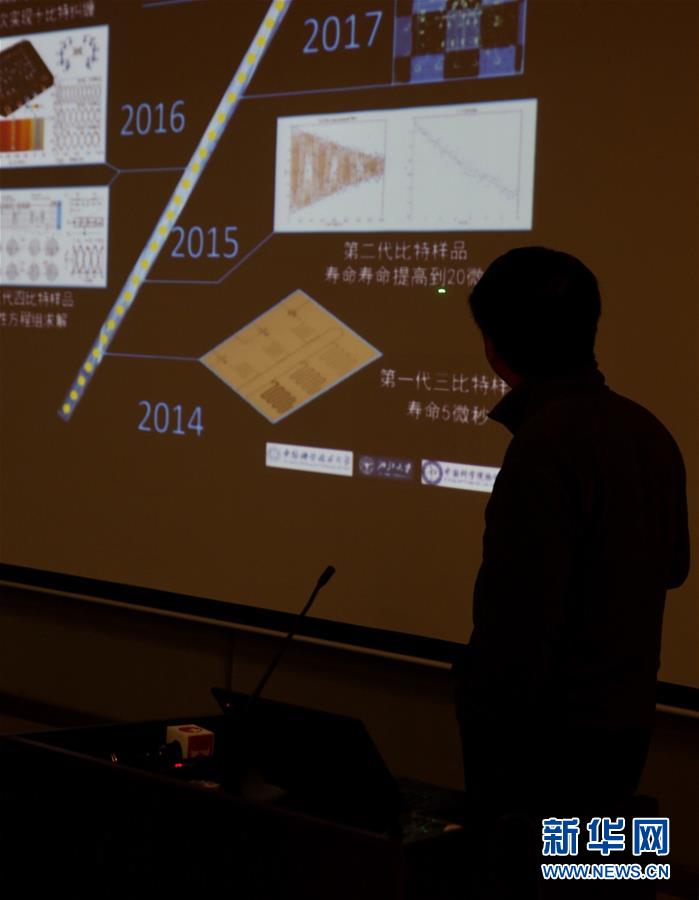 2017年5月3日,中國科學(xué)技術(shù)大學(xué)潘建偉院士在上海宣布,我國科研團(tuán)隊(duì)成功構(gòu)建的光量子計(jì)算機(jī),首次演示了超越早期經(jīng)典計(jì)算機(jī)的量子計(jì)算能力。這是潘建偉院士在介紹“超導(dǎo)量子計(jì)算機(jī)路線圖”。 新華社記者 金立旺攝