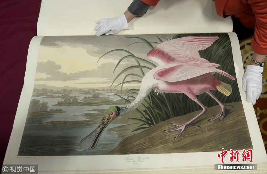 2018年12月12日消息,英國格拉斯哥,世界上最貴的印刷書——美國鳥類學(xué)家、畫家和博物學(xué)家詹姆斯·奧杜邦手繪的第一版《美國鳥類》被罕見取出米切爾圖書館保險庫公開亮相。圖片來源:視覺中國