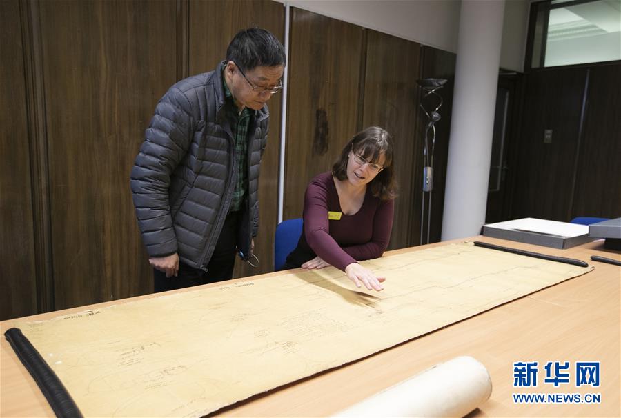 11月2日,在英國(guó)紐卡斯?fàn)柕奶┒鳌枡n案館,檔案管理員瑞秋·吉爾(右)向新華社記者介紹致遠(yuǎn)艦設(shè)計(jì)圖紙。 新華社記者 韓巖 攝