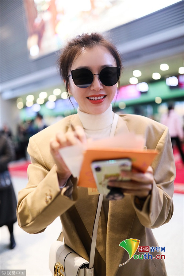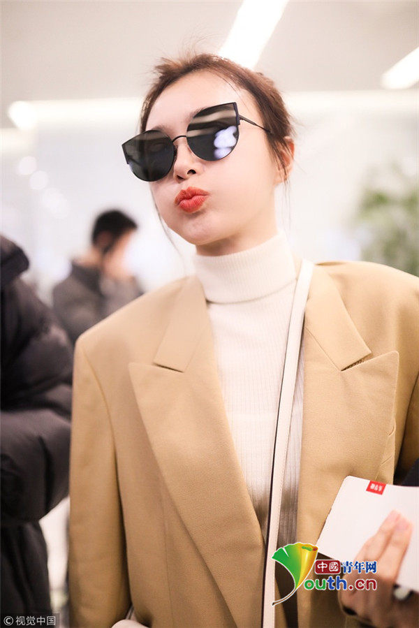 11月29日,上海,秦嵐現(xiàn)身機場。她戴白色鴨舌帽,穿白色星星圖案外套配微喇牛仔褲,架黑超涂紅唇笑靨如花。